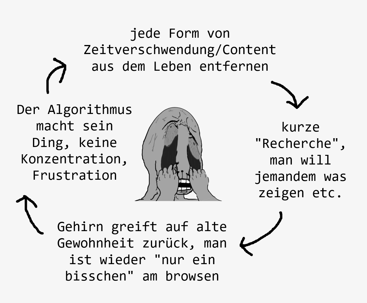 In der letzten Woche oder zwei habe ich ein riesen Problem mit meiner Konzentration, wenn es darum geht, für die Uni was zu machen. Ich vermute es ist meine Internetsucht. Ich hasse es so sehr, wie man davon absorbiert wird. Bei mir ist es ein Zyklus von reinfallen und ausbrechen. Skizze: